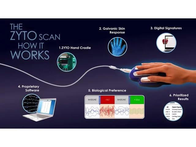 A non-invasive Zyto Biofeedback scan is used to identify imbalances and appropriate nutritional supplements. The Zyto scan analyzes galvanic skin response in 3 areas: Energetic, Emotional & Functional. By looking at your responses in these 3 areas, the Zyto scan helps identify which systems need support.